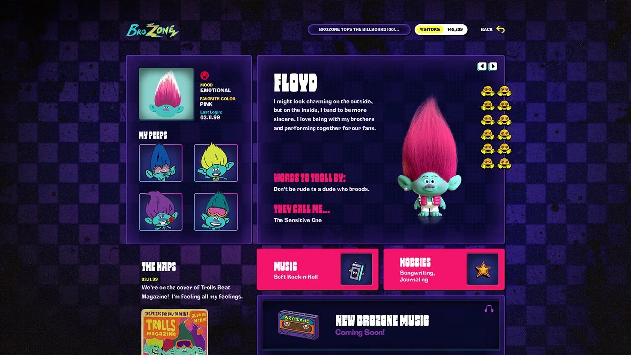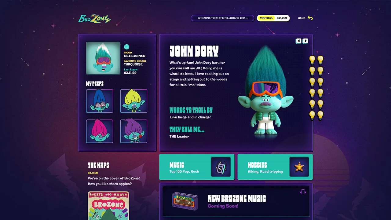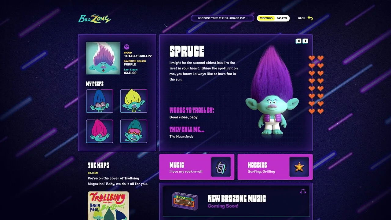 Studio City was excited to collaborate with DreamWorks Animation to bring the vibrant universe of "Trolls" to life through an immersive web experience. Our collaboration centered around their highly anticipated animated film, "Trolls Band Together," where DreamWorks sought to craft a website that captured the essence of the 90s-inspired boy band sensation known as "BroZone."